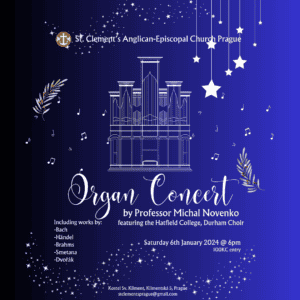 Saturday 6th January 2024 – Organ concert at St. Clement’s by Professor Michal Novenko. We are immensely privileged at St. Clement’s to have Professor Michal Novenko as our regular organist. Professor Novenko has been a Professor of Improvisation at the Prague Conservatoire since 1990 and has performed at many major international organ festivals. He is indubitably one of the most accomplished organists in Prague, if not Europe. On the 6th of January 2024 Professor Novenko treated us to some of the very best pieces from his repertoirs, including Brahms, Handel, Bach, Smetana and Dvořák as well as an example of his own magnificent improvisation skills. During the concert we were treated to a short but truly remarkable performance by the Choir of Hatfield College, University of Durham, who were on a choir tour to Prague. If you missed it, you can hear a recording of the full concert here.