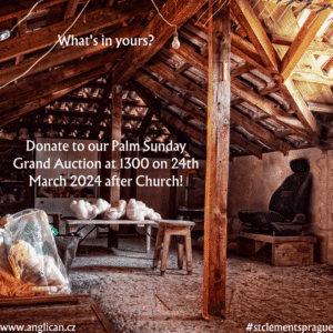Sunday 24th March 2024 – 2024 Grand Auction in aid of St. Clement’s. We came together after our Palm Sunday service for a spirited 2024 Grand Auction which raised over 25,000 Kc for St. Clement’s. Great fun was had by all and we would like to thank both all those who kindly donated such a cornucopia of items for auction as well as those who bid (and sometimes won!) items to take home with them.